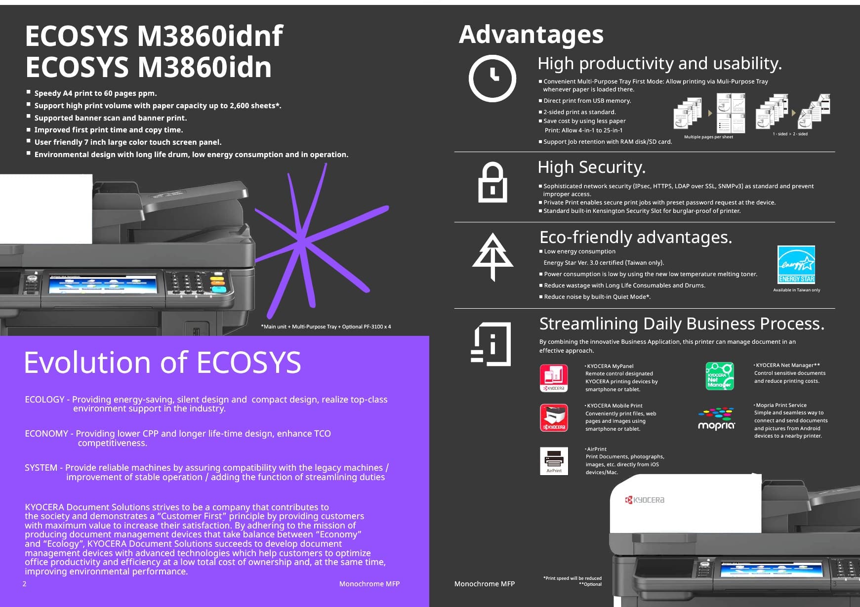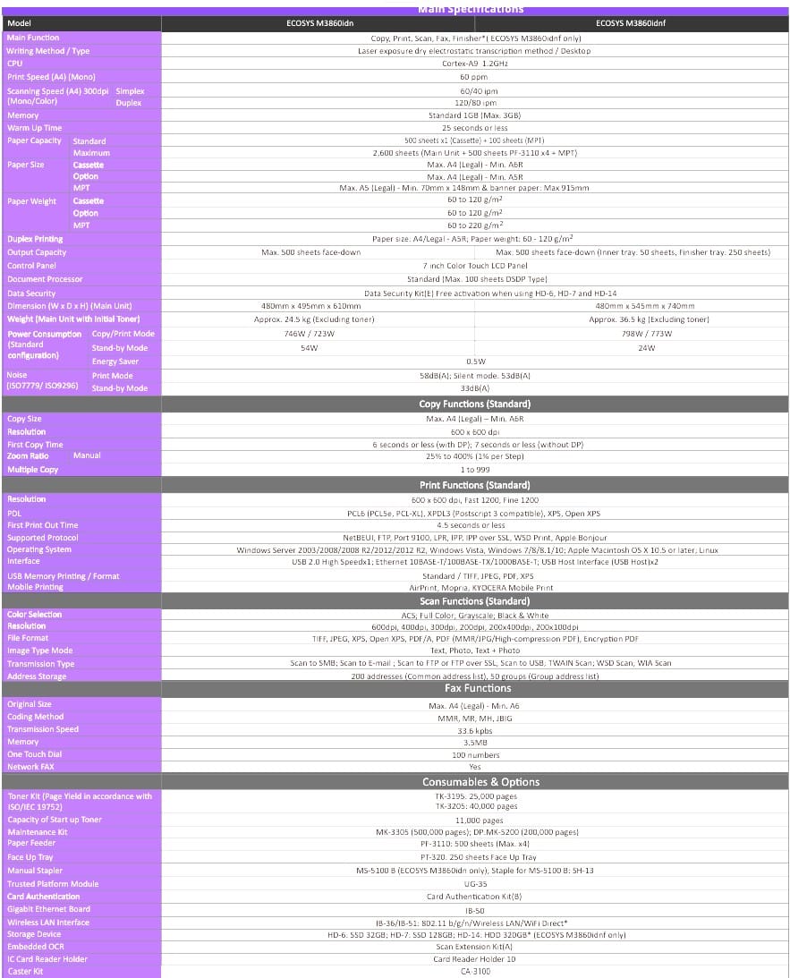 - Mobile Printing: Apple AirPrint®, Mopria®, Google Cloud Print™, KYOCERA Mobile Print