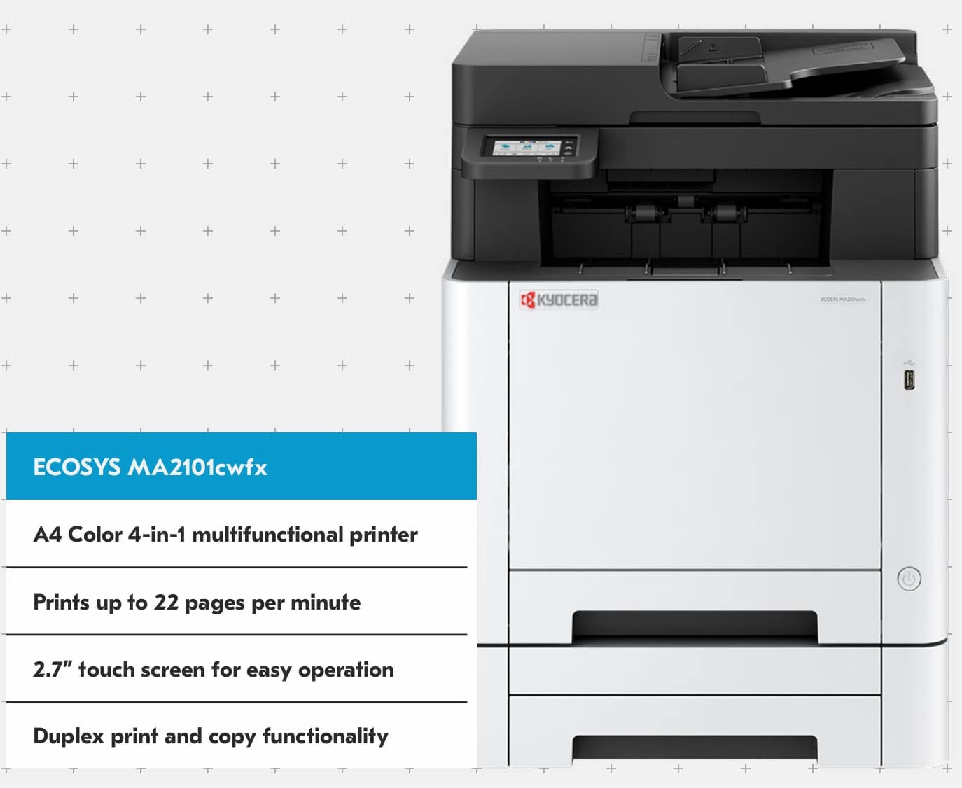 The ECOSYS MA2101cwfx is a compact, energy-efficient, A4 color multifunction printer designed to meet the demands of remote workspaces, small offices, or home-based professionals. With robust security features, cloud and mobile compatibility, and reliable duplex print/copy capabilities, this 4-in-1 device (print, copy, scan, fax) offers professional-quality output and seamless integration into modern workflows.