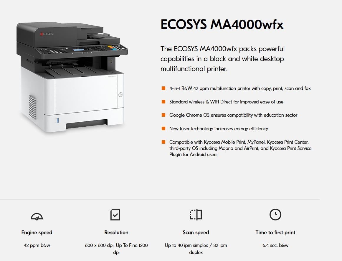 The Kyocera ECOSYS MA4000wfx is a robust and versatile multifunction printer that delivers exceptional performance, eco-friendliness, and advanced security for modern businesses. With its efficient design and flexible configuration options, it’s a valuable asset for any office environment.