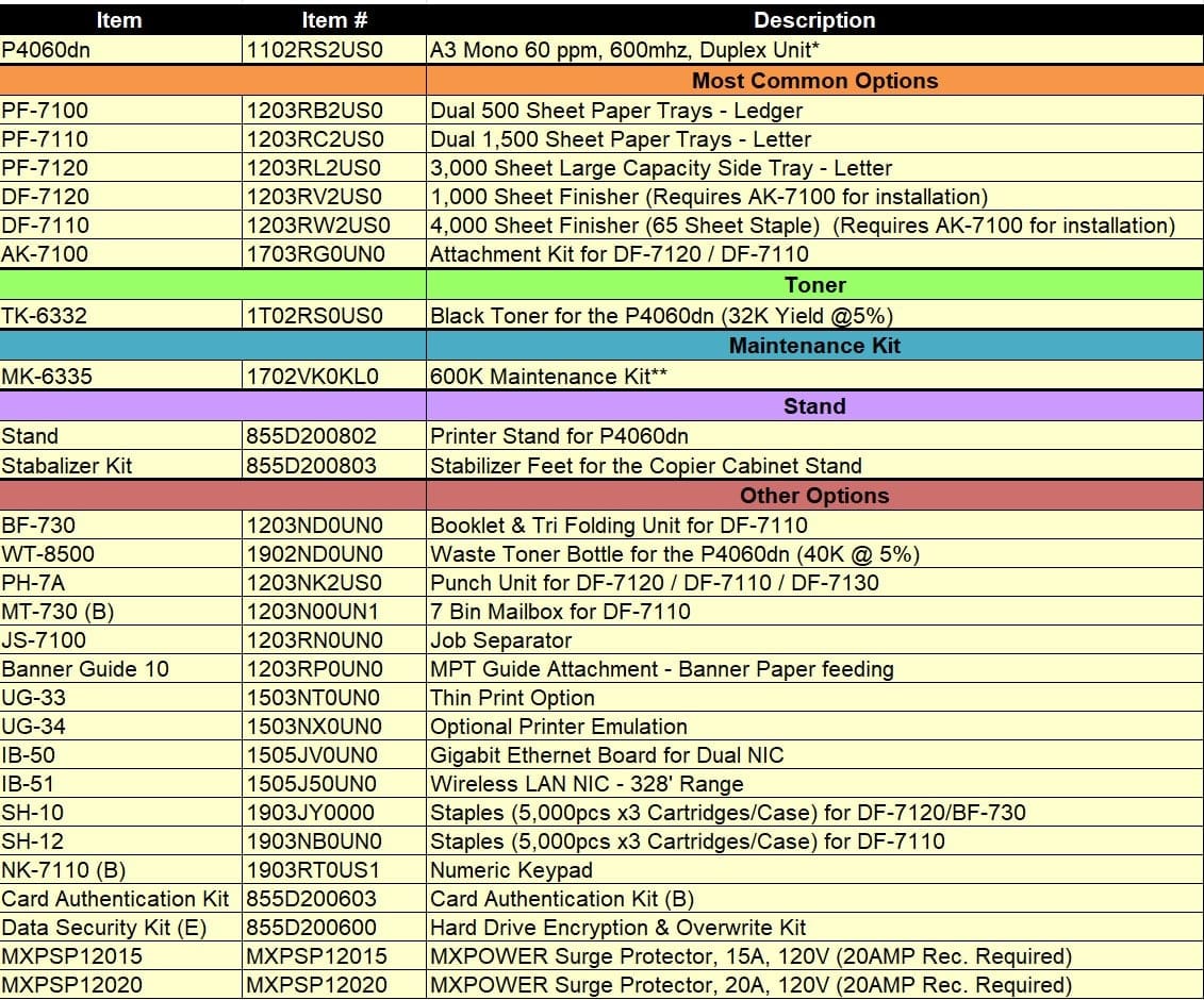 - 4,000-Sheet Finisher (65-sheet stapling and manual staple) – Product Code: DF-7110