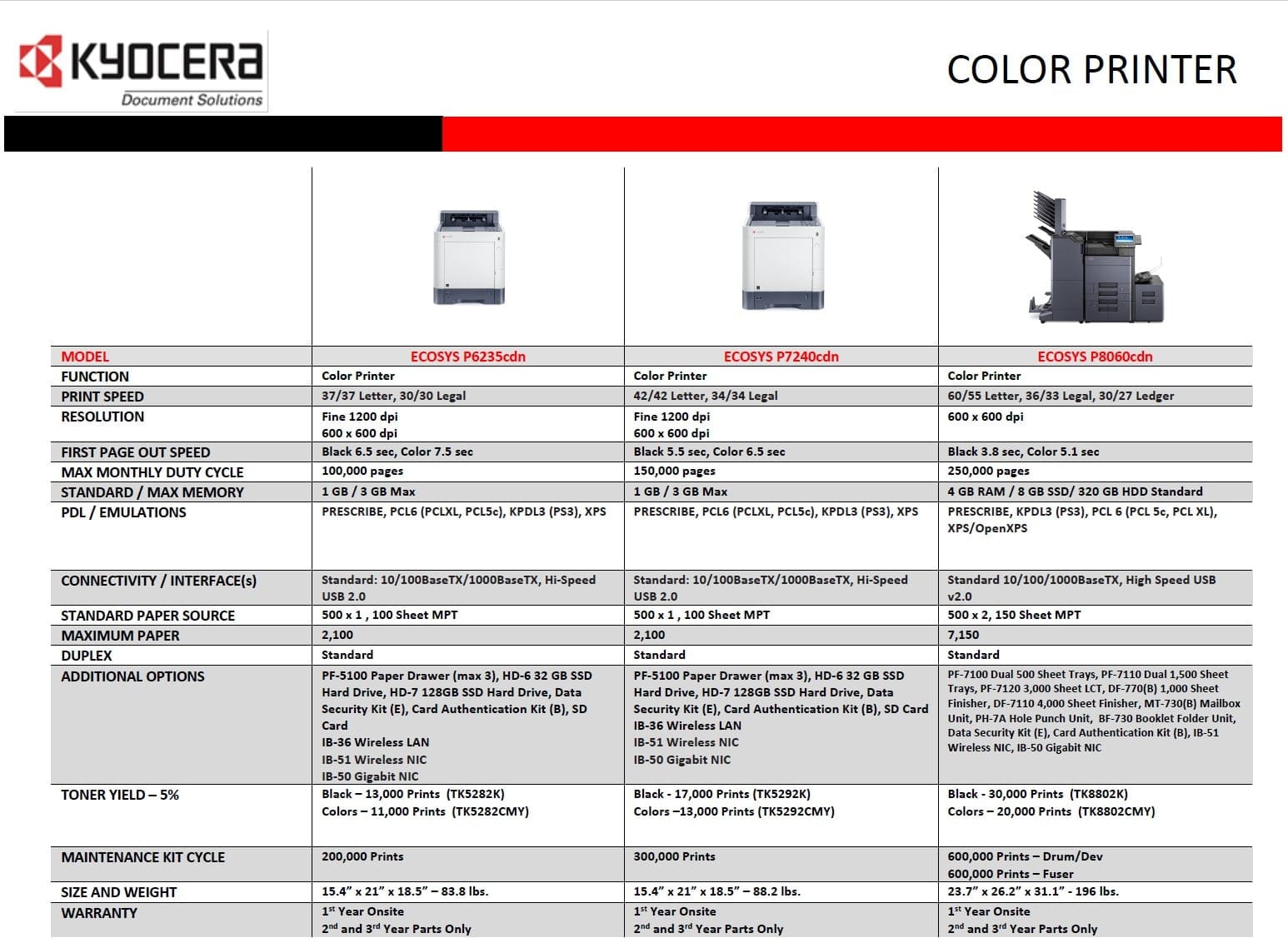 Impressive performance at speeds up to 37 ppm, advanced features and low total cost of ownership make the ECOSYS P6235cdn, Color A4 (up to 8.5″ x 14″) printer the smart choice to drive your business needs. Its large paper capacity (up to 2,100 sheets), 200,000 image per month duty cycle, long life consumables and true 1200 x 1200 dpi print resolution can keep up with the pace of your business without sacrificing output, giving you the quality and performance, your business deserves.