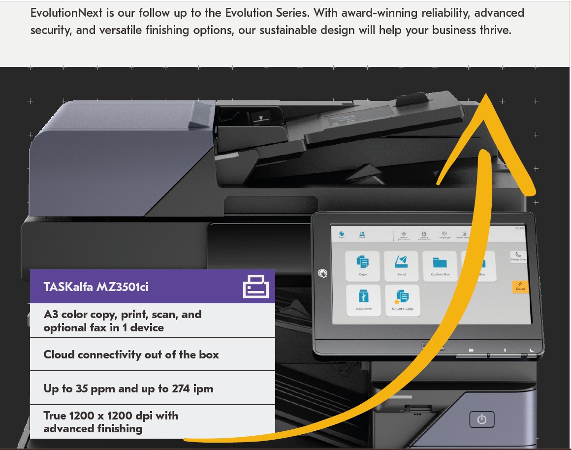 The Kyocera TASKalfa MZ3501ci is a feature-rich, reliable, and secure multifunction printer designed to meet the diverse needs of modern business environments. With its advanced document processing capabilities, robust security architecture, and flexible finishing options, this A3 color MFP enables efficient document workflows and high-quality output. Part of the Evolution Next line, this device builds on Kyocera’s legacy of durability and sustainability while offering cutting-edge innovations in speed, control, and scalability.